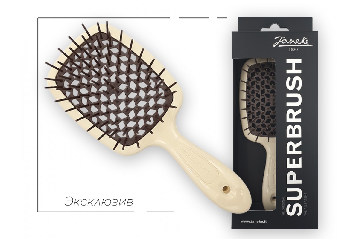 Самая популярная модель расчесок Janeke -это Superbrush уникальная массажная щетка с запатентованной технологией, которая подойдет для ухода за волосами всех типов и детскими волосами. У нее особая форма зубчиков, которая позволяет за несколько минут распутывать даже самые запутанные волосы. Зубчики расчески не травмируют кожу головы и позволяют расчесывать влажные волосы и без проблем кучерявые волосы.