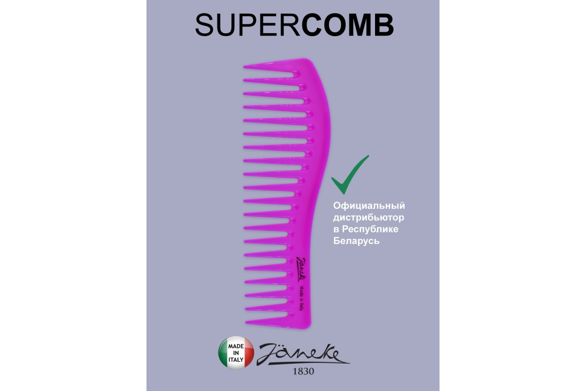 Одна из популярных расчесок Janeke  -это Supercomb уникальный гребень с запатентованной технологией, которая подойдет для ухода за волосами всех типов и детскими волосами. У нее особая форма зубчиков, которая позволяет за несколько минут прочесать волосы, организовать локоны в укладке или распределить укладочные средства. Зубчики расчески не травмируют кожу головы и позволяют расчесывать влажные волосы и без проблем кучерявые волосы.