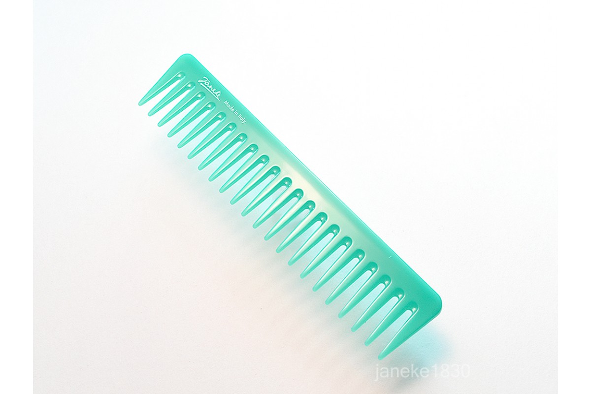 Одна из популярных расчесок Janeke -это Supercomb уникальный гребень с запатентованной технологией,которая подойдет для ухода за волосами всех типов и детскими волосами.У нее особая форма зубчиков,которая позволяет за несколько минут прочесать волосы,организовать локоны в укладке или распределить укладочные средства.Зубчики расчески не травмируют кожу головы и позволяют ррасчесывать влажные волосы и без проблем кучерявые волосы.