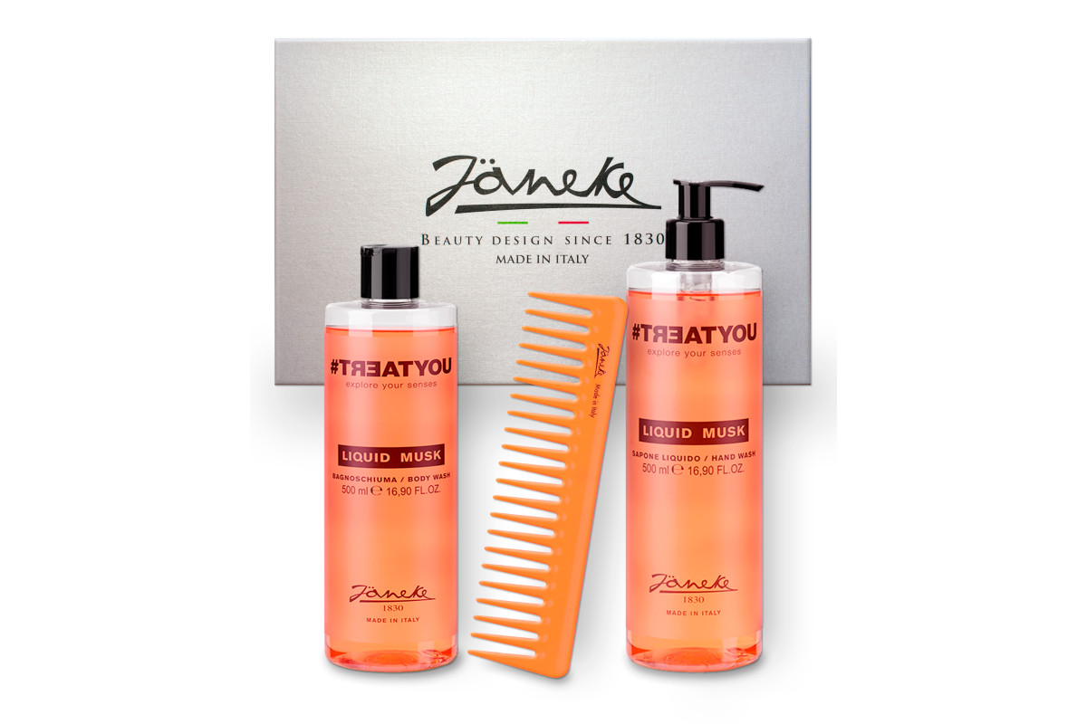2.Жидкое мыло для рук Janeke#Treatyou Liquid Musk Hand Wash эффективно и в одновременно бережно очищает кожу от различных загрязнений, насыщает питательными компонентами, предотвращает сухость и шелушение. Оно обладает гармоничным сочетанием древесного и бальзамического аромата с экзотическими нотами ванильных бобов тонка и амбры. Данное средство глубоко увлажняет кожный покров и стимулирует его обновление. Позитивные свойства представленного гигиенического продукта подтверждены сертификатами качества ведущих европейских косметологических лабораторий.